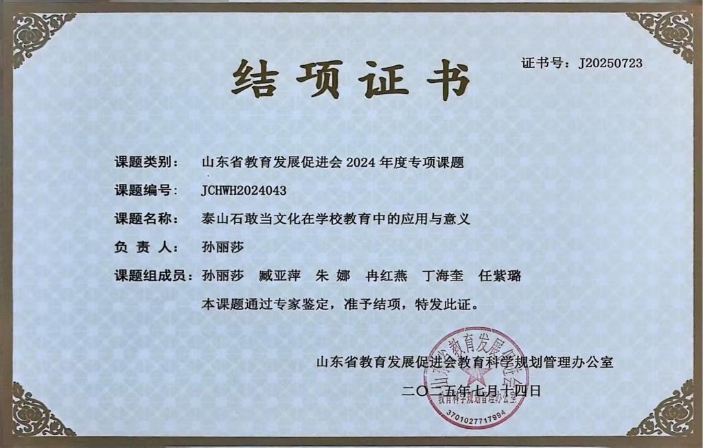 近日,从山东省教育发展促进会传来喜讯,由太阳成集团122ccvip秘书学教研室孙丽莎老师负责的山东省教育发展促进会2024 年度专项课题《泰山石敢当文化在公司教育中的应用与意义》(课题编号:JCHWH2024043),经专家严格鉴定,成功准予结项,山东省教育发展促进会教育科学规划管理办公室为此颁发了结项证书(证书号:J20250723)。