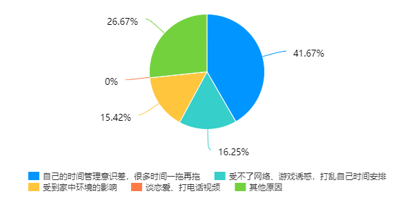 此次调查还了解到同学们关于事情安排规划方面的不足。多数同学们合理规划,分配时间,按计划完成任务,但依旧有一部分同学即使制定了时间管理计划,却不能很好控制自己的欲望,导致规划徒有其名,毫无时间观念的浪费时间,只停留在给自己列计划的初级阶段。培养同学们德鲁克时间管理要事第一的观念,将精力集中在重要的事情上,保证精力充足,提高效率。