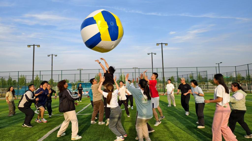 排球比赛开始,那颗充气排球在空气中划出轻飘飘的弧线,像被风吹起的泡泡,每一次弹跳都带着一种近乎滑稽的迟缓。“我来!”有人大喊一声,猛地跃起,手掌“啪”地拍在球面上。可充气排球不比普通排球,这一击没让它凌厉地飞过网,反而像被轻轻推了一下的气球,晃晃悠悠地飘向对面,甚至中途还被一阵风带偏了轨迹,对面严阵以待的队友们顿时乱作一团。