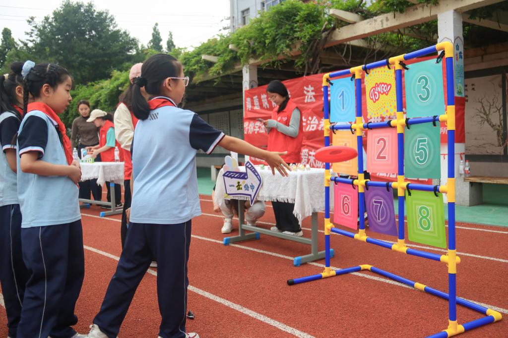 “看我的超级投掷——中!”飞盘似箭矢般划破空气,划出一道优美弧线,精准命中九宫格靶盘的“网络暴力”区域!围观的同学们即刻沸腾,纷纷表示:“遭遇恶意评论需及时截图留存证据,应勇敢向相关部门举报,切勿怯懦退缩!”在操场上此起彼伏的欢呼声中,同学们化身为“正义小特工”,摩拳擦掌地迎接靶盘上的“秘密任务”。飞盘撞击靶盘的“咚咚”声与孩子们的欢笑声交织成曲,而《未成年人保护法》的条文,早已化作颗颗“能量宝石”,在每一次投掷与讨论中,悄然融入少年们的心田,点亮了属于他们的勇敢与智慧之光。