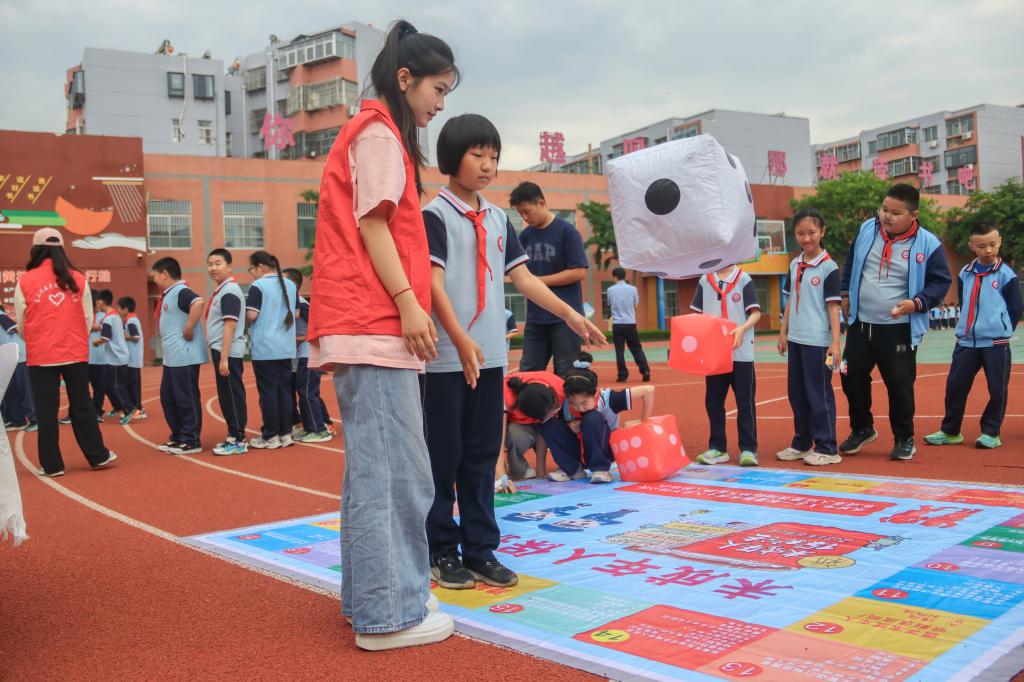 操场瞬间变成了“法律游乐园”,一张铺满彩虹色格子的巨型棋盘上,藏着数不清的“权益密码”。同学们两两组队,化身“守护小拍档”,通过投骰子解锁格子里的趣味问答,在笑声中学习“隐私权不容侵犯”“拒绝家庭暴力”等知识点。