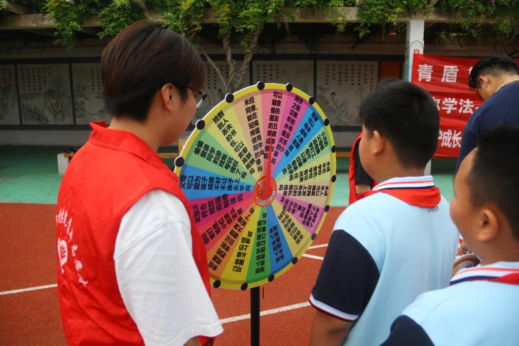 彩色大转盘中的每个格子均蕴含着“法律小秘密”。同学们踮起脚尖,目光紧紧聚焦于转盘上的“神秘任务”。“轮到我来啦!”小同学兴奋地一转,指针“哒哒”停在了“隐私保护”区,他立马叉腰喊道:“未经同意拍同学照片发短视频?绝对不行!”围观的小伙伴们拍手欢呼,笑声和掌声交织成一片欢乐的海洋。