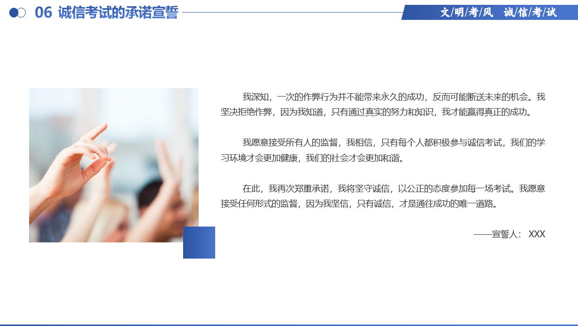 活动内容包括三个环节:首先由学习委员系统讲解公司考试规章制度,从考场纪律到违纪处理办法,结合法学专业特点进行案例式解读,让同学们深刻认识到违规的严重后果;随后进入互动讨论环节,围绕“诚信与学业成长”主题,同学们踊跃发言。李金耀同学动情地说:“无论是法考还是公考,都以诚信为基本准则。期末考试正是检验我们诚信品质的最好试炼,只有用真才实学作答,才对得起自己日夜苦读的付出。”最后,全体同学庄重签署了诚信考试承诺书,用实际行动践行对公平正义的守护。