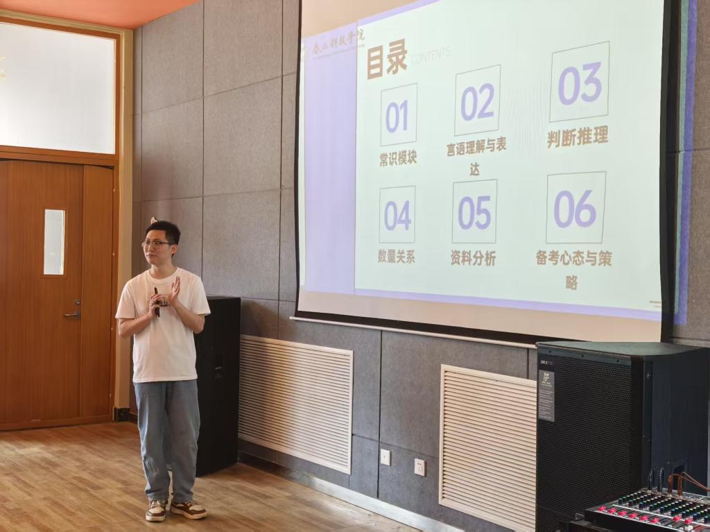 第二位发言人王永毅学长则着重讲解了申论的备考要点。他指出,申论的关键在于对材料的理解和分析能力。在日常学习中,要养成关注时事热点的习惯,学会从不同角度分析问题,积累规范的表述和优秀的案例。在答题时,要认真审题,明确题目要求,精准提炼材料中的关键信息,有条理地组织答案。此外,他还分享了自己在面试环节的经验,提醒同学们注重语言表达的流畅性和逻辑性,保持良好的心态和精神面貌。